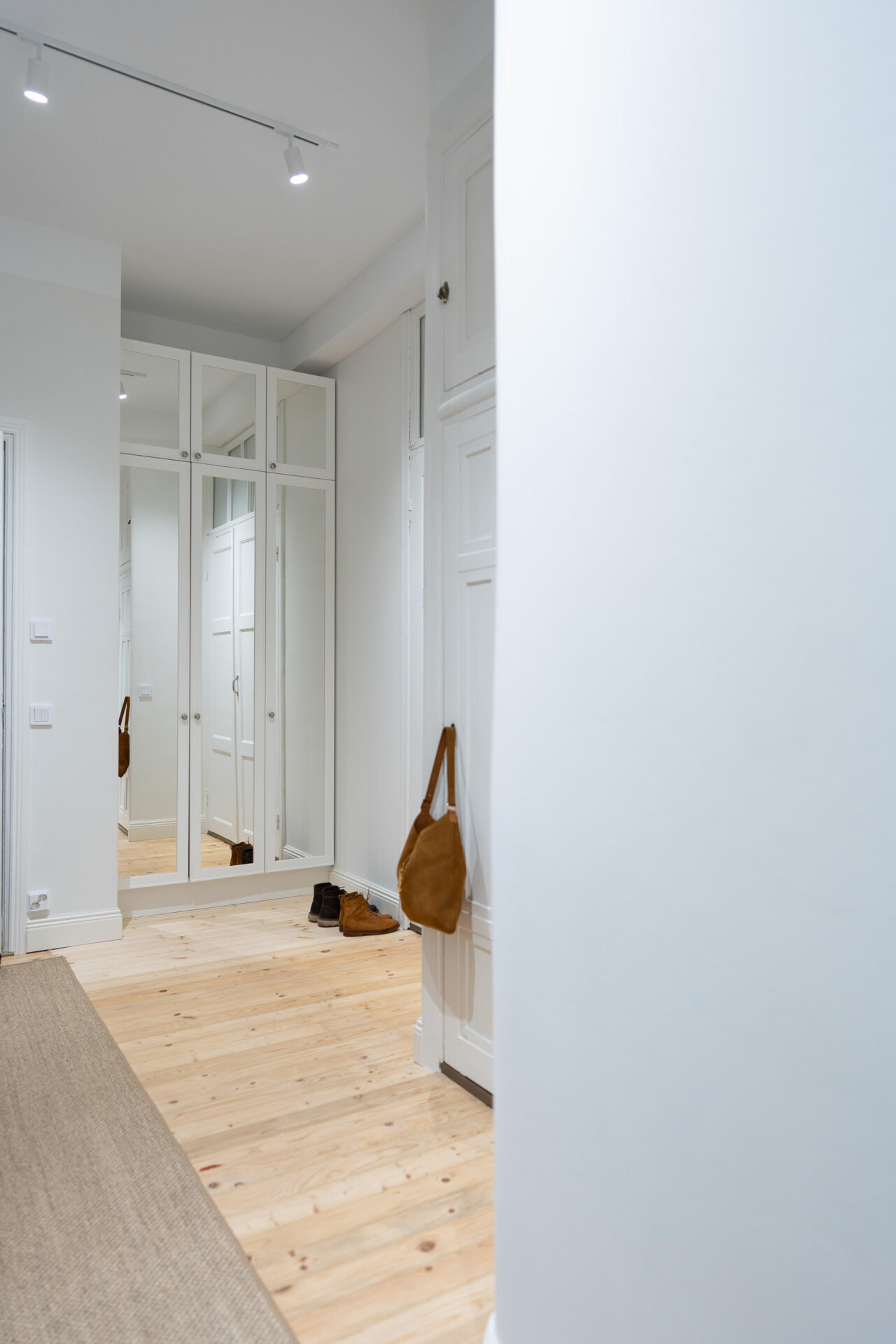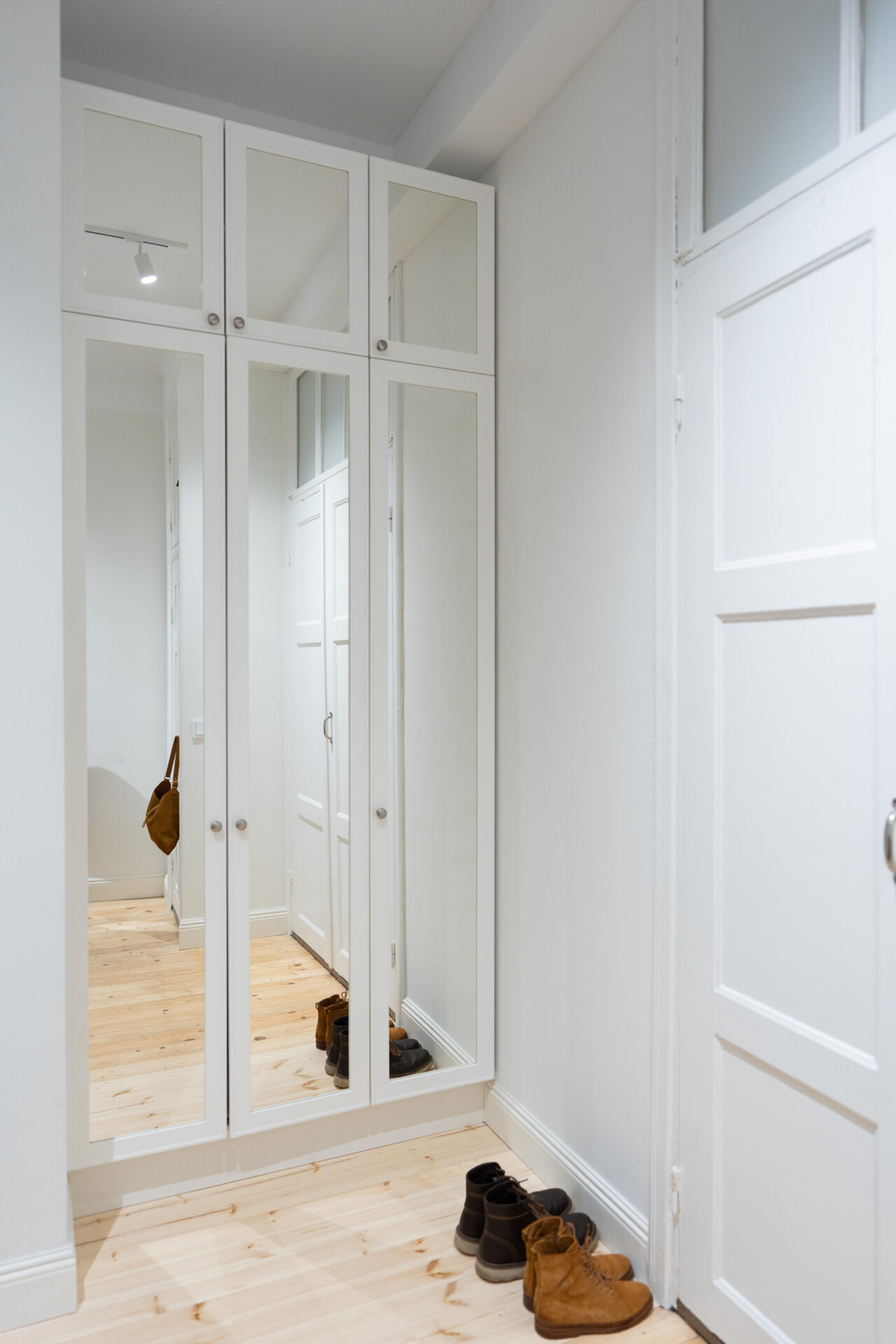 Ikkunattomassa tilassa peilit heijastavat valoa ja moninkertaistavat avaruuden tunnun. Niistä on myös helppo vilkaista kotoa lähtiessä, että asu on kunnossa. Saranaovellisessa eteiskaapistossa kirkkaat peilit yhdistettiin Mellanon lasiaukollisiin Aura-oviin. Vetimien oli tarkoitus olla samaa mallia kuin muualla kodissa, mutta asukkaat päätyivät vaihtamaan ne Helatukun Ball-nuppeihin. Valkoisten ovien, peilin ja vähäeleisten vetimien yhdistelmä ei huuda tiettyä vuosikymmentä, joten sille on helppo povata pitkää ikää!