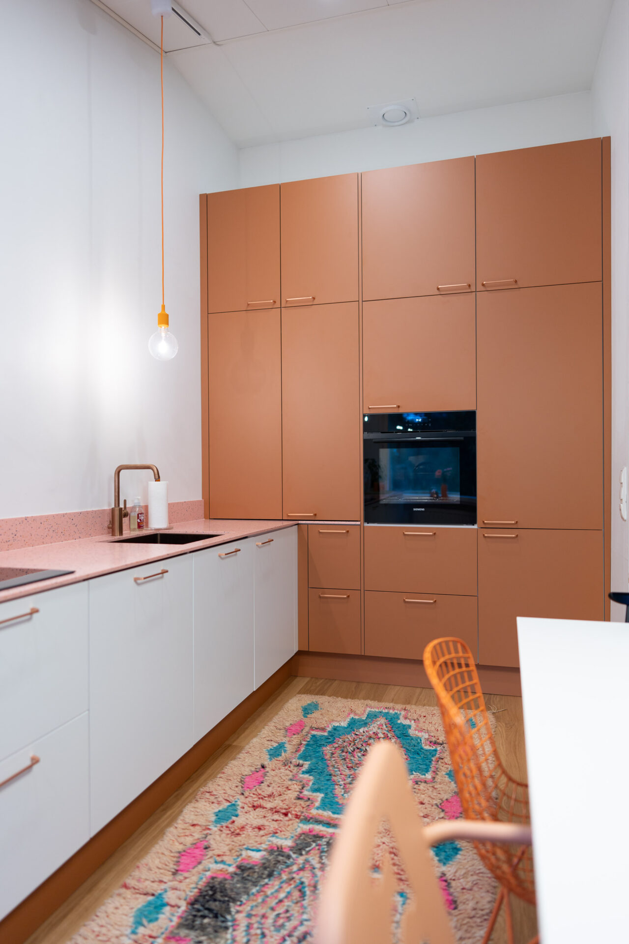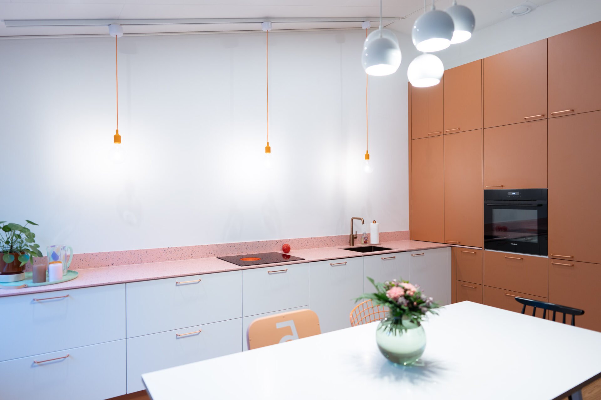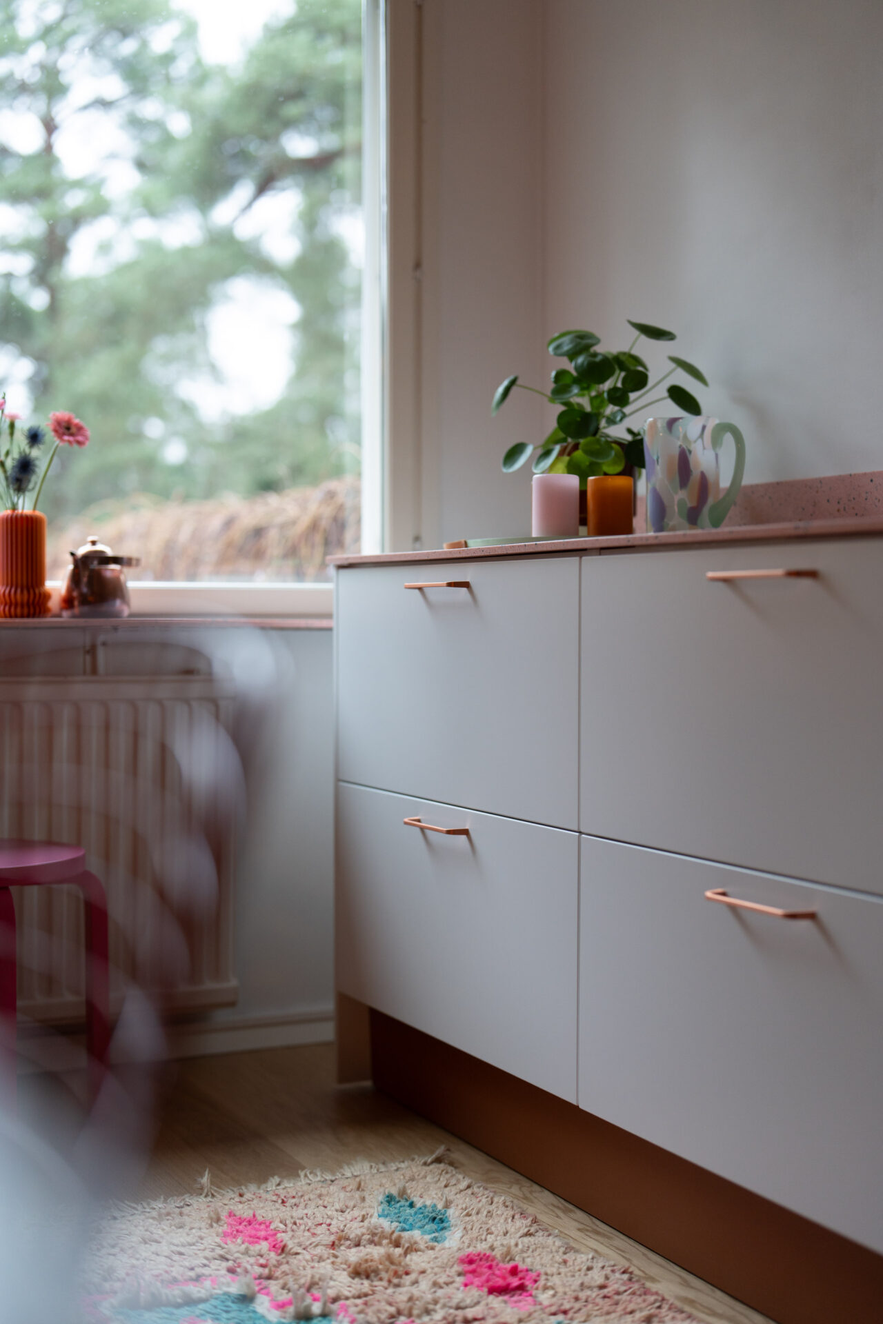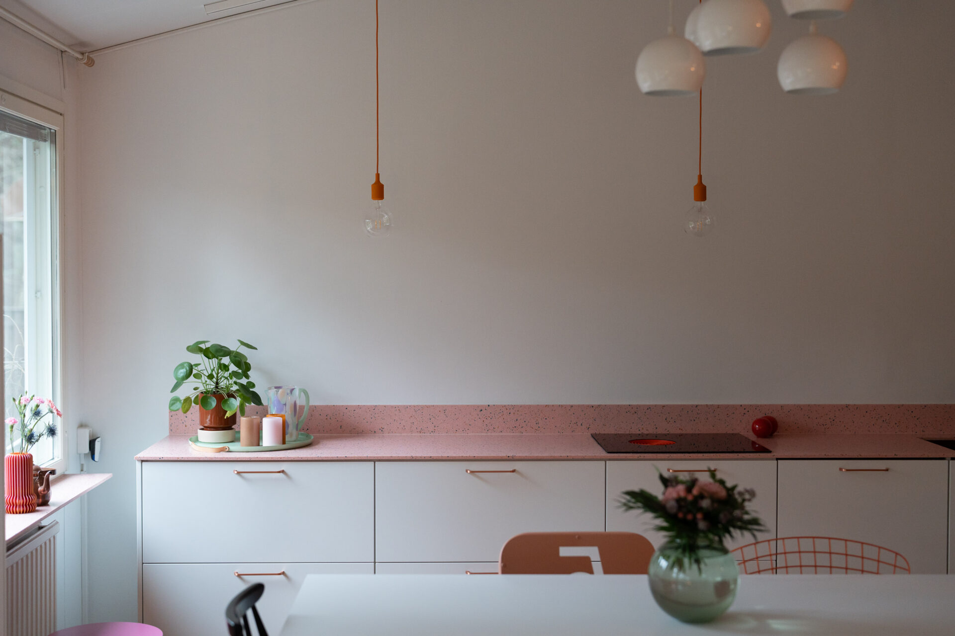 Jos on kaapistoihin nykyään tarjolla monenlaista materiaalia, niin on myös työtasoihin. Suomalainen Durat ei pyytele anteeksi olemassaoloaan vaan tarjoaa karkkivärejä kodin pinnoille. Uusiomuovia hyödyntävä komposiittimateriaali on kestävä, hygieeninen ja täysin kierrätettävä. Tähän keittiöön valittiin Durat Palace – mallistosta Gin Daisy -kuosi, jossa seikkailee muun muassa oransseja värimuruja. Siitä valmistui tilaan myös uusi ikkunalauta. Pieni ratkaisu sitoo kokonaisuuden kivalla tavalla yhteen.