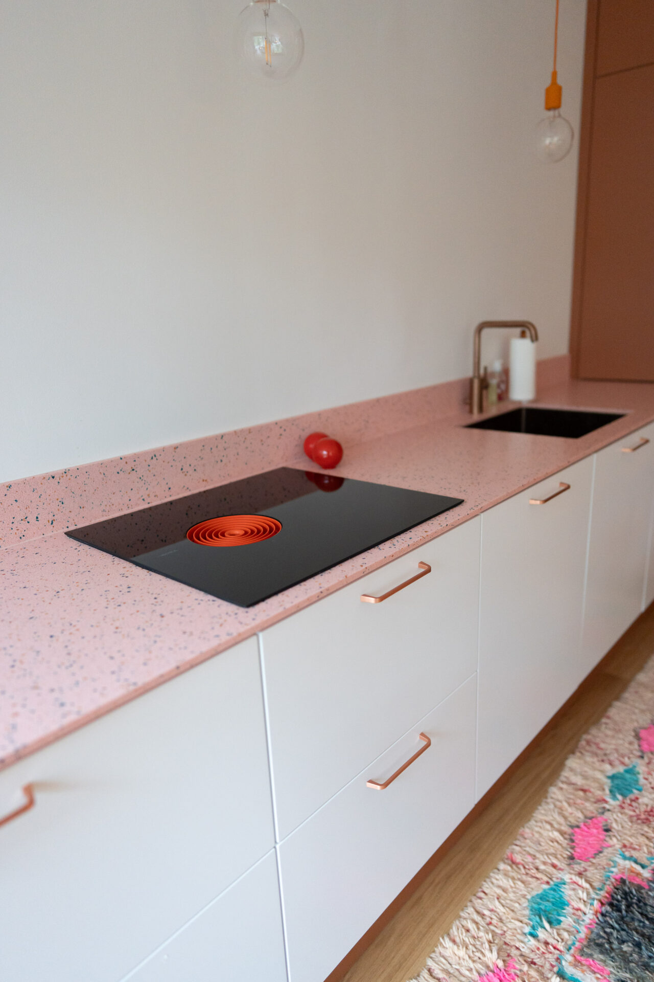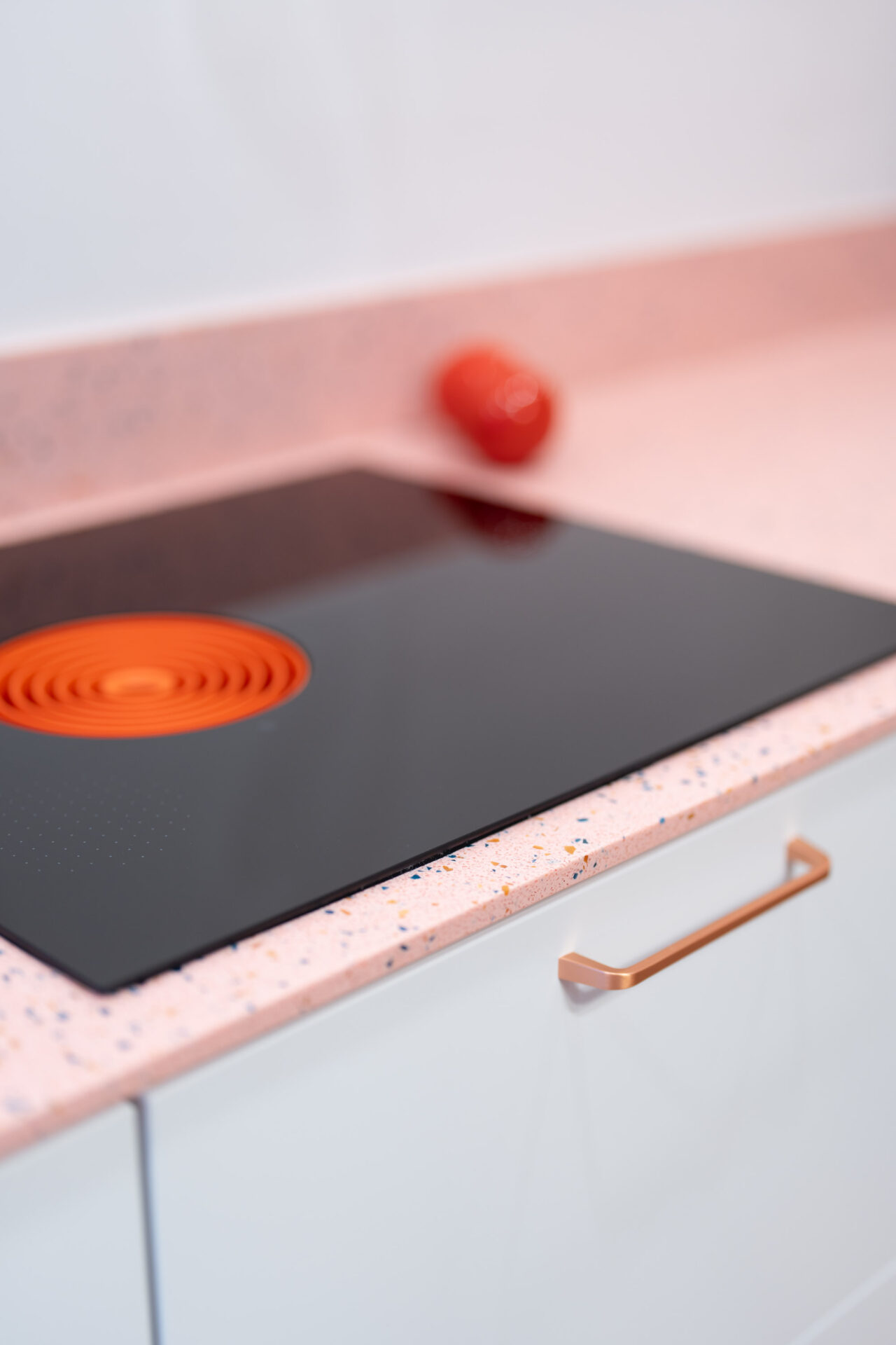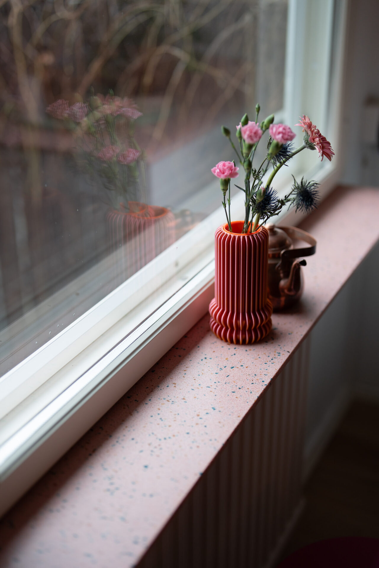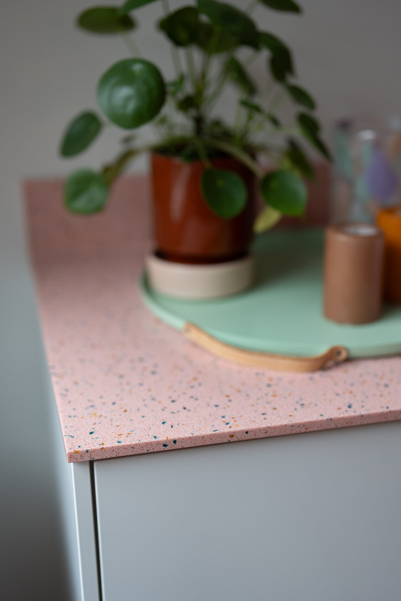 Jos on kaapistoihin nykyään tarjolla monenlaista materiaalia, niin on myös työtasoihin. Suomalainen Durat ei pyytele anteeksi olemassaoloaan vaan tarjoaa karkkivärejä kodin pinnoille. Uusiomuovia hyödyntävä komposiittimateriaali on kestävä, hygieeninen ja täysin kierrätettävä. Tähän keittiöön valittiin Durat Palace – mallistosta Gin Daisy -kuosi, jossa seikkailee muun muassa oransseja värimuruja. Siitä valmistui tilaan myös uusi ikkunalauta. Pieni ratkaisu sitoo kokonaisuuden kivalla tavalla yhteen.