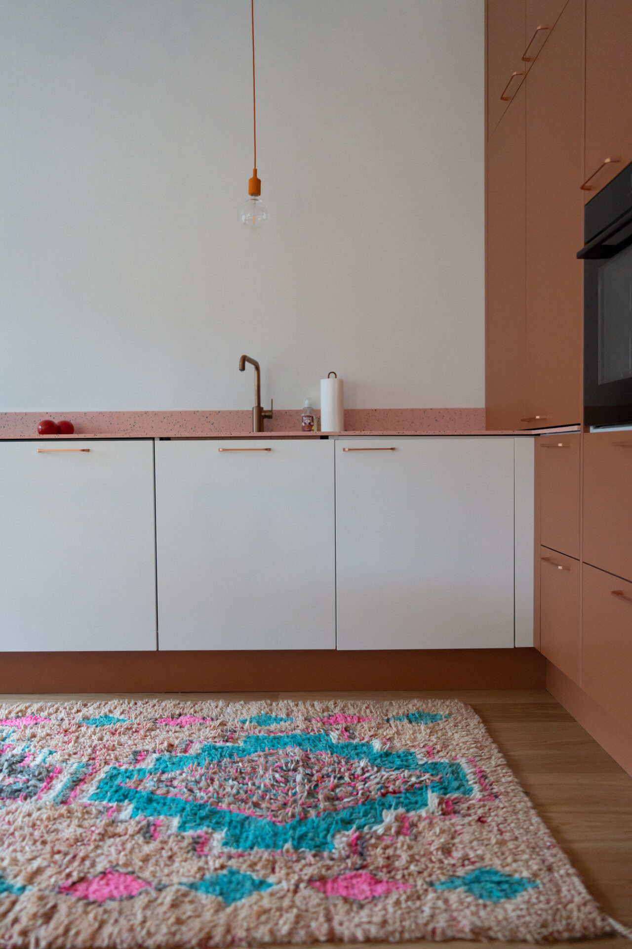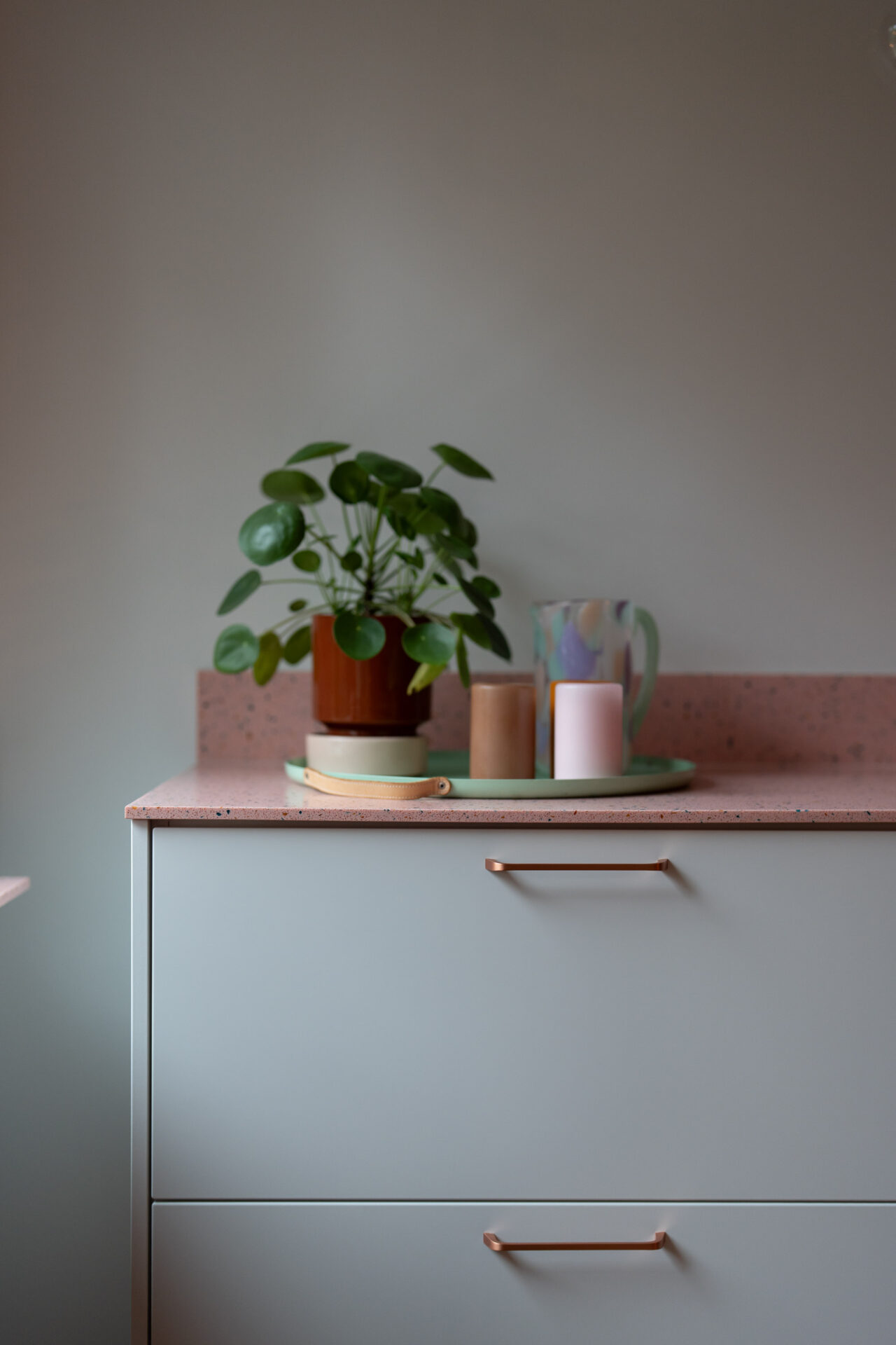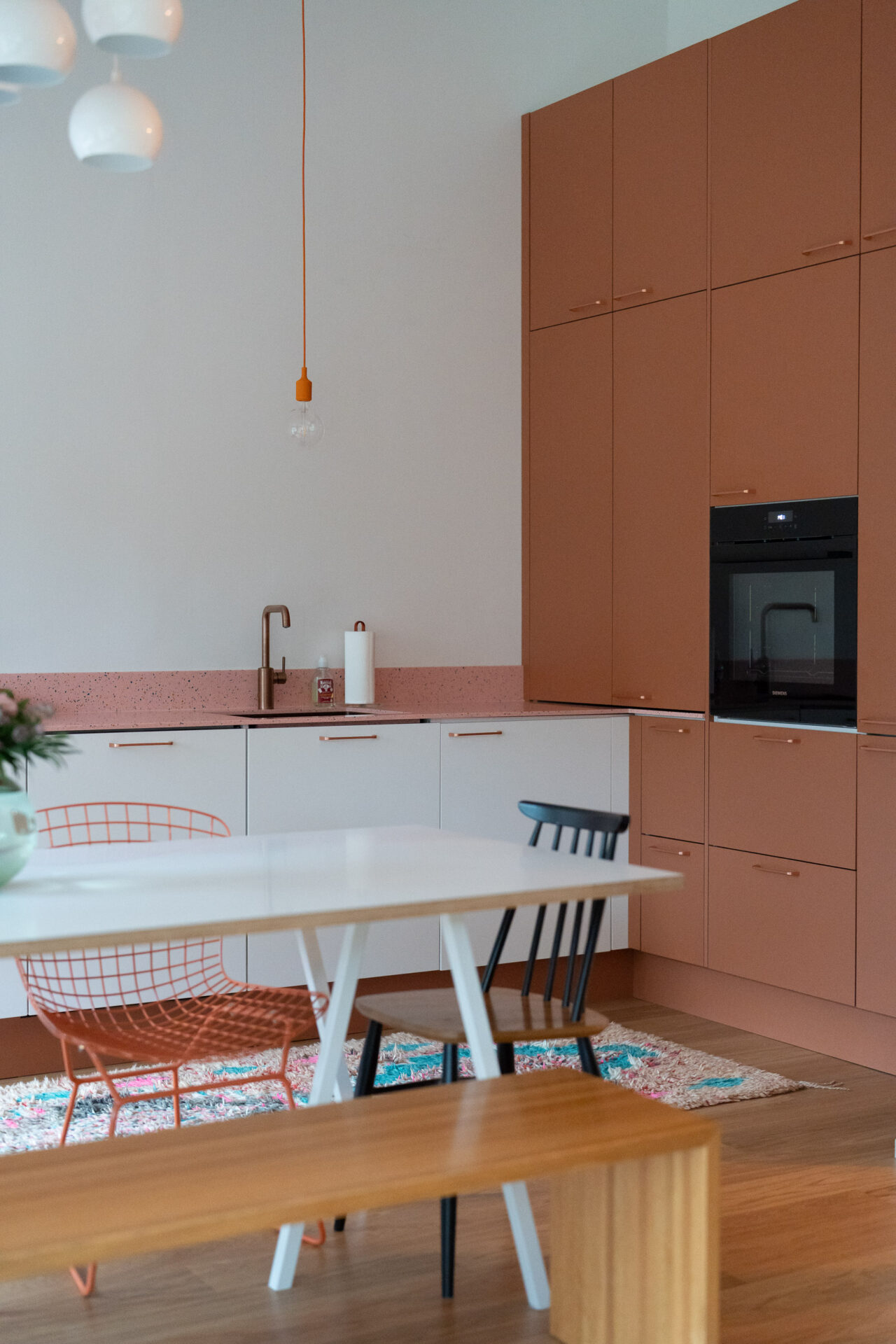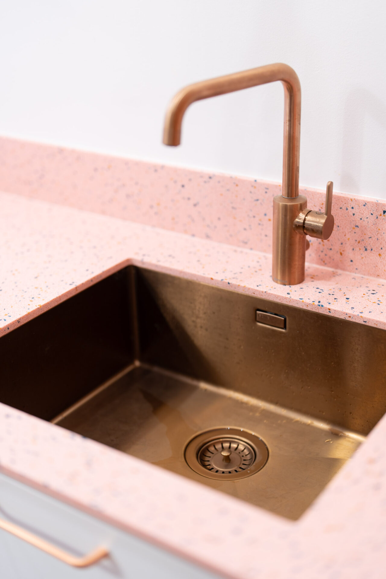 Jos on kaapistoihin nykyään tarjolla monenlaista materiaalia, niin on myös työtasoihin. Suomalainen Durat ei pyytele anteeksi olemassaoloaan vaan tarjoaa karkkivärejä kodin pinnoille. Uusiomuovia hyödyntävä komposiittimateriaali on kestävä, hygieeninen ja täysin kierrätettävä. Tähän keittiöön valittiin Durat Palace – mallistosta Gin Daisy -kuosi, jossa seikkailee muun muassa oransseja värimuruja. Siitä valmistui tilaan myös uusi ikkunalauta. Pieni ratkaisu sitoo kokonaisuuden kivalla tavalla yhteen.