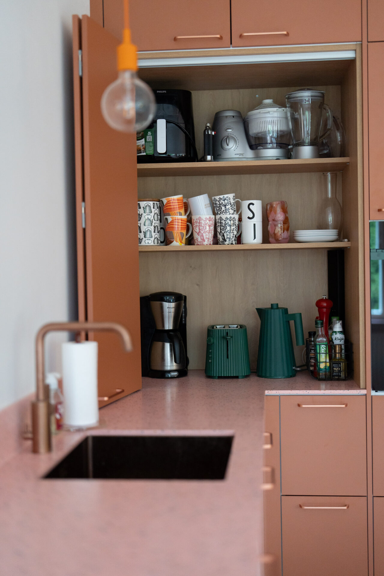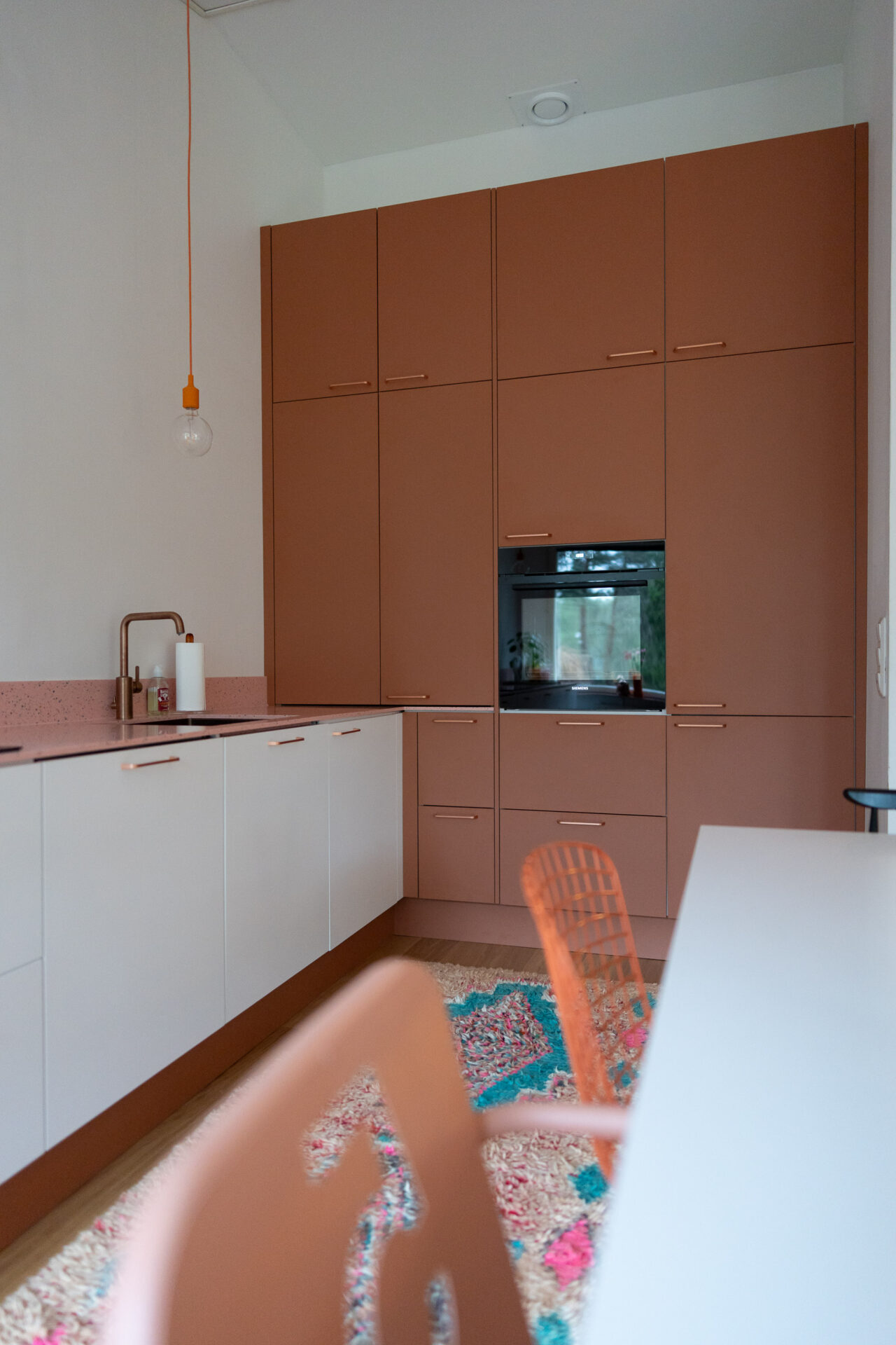 Tehostevärinä keittiössä toimii kupari, joka sointuu hienosti kaapistojen murrettuun oransssiin. Vesipisteellä komeilevat Tapwellin PVD-pinnoitettu allas sekä Damixan Silhouette-hana. Niiden lisäksi kuparin sävy toistuu myös Track-vetimissä. Vähän sähäkämpää oranssia puolestaan löytyy Bora S Pure -tasoliesituulettimen ilmanohjaimesta. Mikä herkullinen väriläiskä!