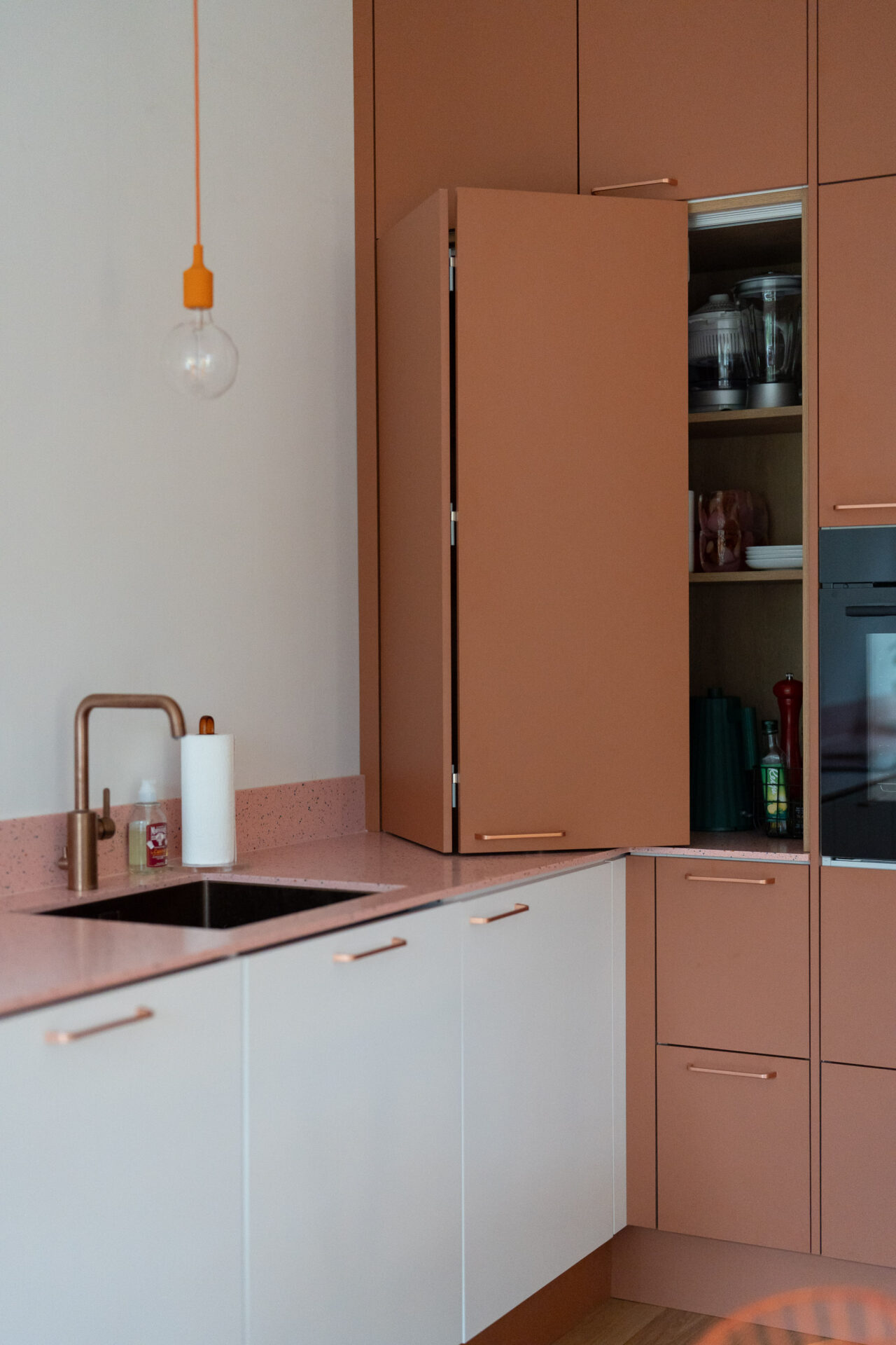 Keittiökaapistoissa päädyttiin yhdistelemään murrettua oranssia sekä valkoista. Ensiksi mainittu löytyi oman tuotantomme levyvärien valikoimasta, ja sitä käytettiin korkealla komeroseinällä. Keittiön matalampi osa sai alakaapistoihin Kensan maalatut Aaria-ovet, jotka tuovat balanssia muuten värikkääseen kokonaisuuteen. WingLine-aamiaiskaapin sisäpuolelta löytyy vielä kolmatta väriä. Joakim ehdotti runko-osiin tammikuosia, joka on yksi oman tehtaamme vakiovaihtoehdoista ja sopii yhteen remontissa uusitun lattian kanssa. Juuri tällaisista oivalluksista asukaspariskunta kiittelee jälkikäteen suunnittelijaa, sillä viimeistellyn näköistä aamiaiskaappia kelpaa nyt pitää auki enemmänkin. Valmistamme kalusterunkoja monessa eri värissä.